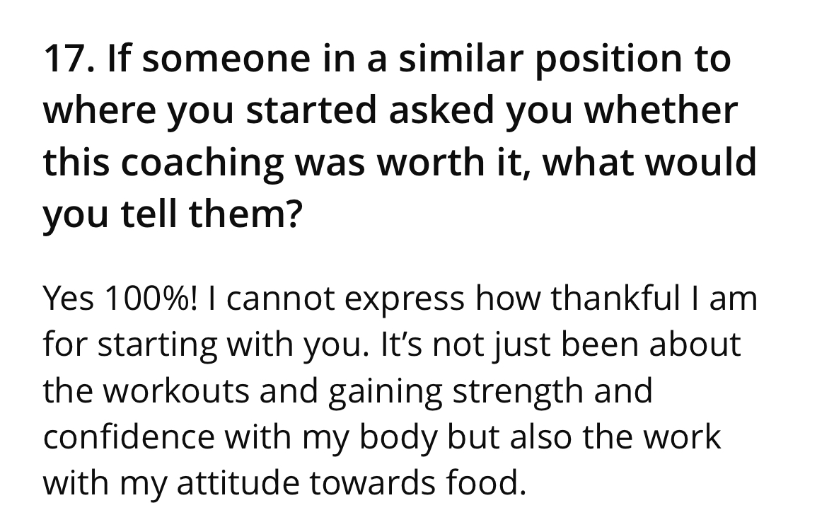 My Breakthrough coaching is a private 3 or 6-month container for women ready to completely transform their body, strength, confidence and capacity through my 3-phase method. Inside this programme, you'll get a fully progressive fitness phased plan including strength workouts, nutritional goals & coaching as well as 1:1 bi-weekly coaching calls to rewire the underlying beliefs and identities, with Neuro Linguistic Programming, that are quietly running the show.